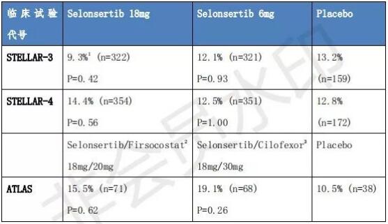 ÔÚÁªÊÊÓÃҩʵÑéÖУ¬Gilead 12Ô·ÝÓÖÐû²¼ÁËÒ»¸öÃûΪATLASµÄ2ÆÚÁÙ´²Ð§¹û¡£Òź¶µÄÊÇselonsertibÍŽáÖÎÁƵÄÁÆÐ§Ò²Ã»ÓÐÌåÏÖ³öÀ´¡£¸ÃÑо¿ÕÐļ392ÃûÑÏÖØ¸ÎÏËά»¯£¨F3-F4£©µÄNASH»¼Õߣ¬½ÏÁ¿ACCÒÖÖÆ¼Áfirsocostat £¨20mg£©£¬FXR¼¤¶¯¼Ácilofexor£¨30mg£©£¬selonsertib£¨18mg£©ÒÔ¼°ÈýÕßÖ®¼äÁ½Á½×éºÏÓëο½å¼ÁÏà±È¶Ô¸ÄÉÆÏËά»¯µÄÓ°Ïì¡£ÓÃÒ©48ÖÜʱ£¬selonsertib/firsocostat×éºÏÓÐ15.5%£¨p=0.62vs.placebo£©NASHÎÞ¶ñ»¯ºÍÏËά»¯¸ÄÉÆÖÁÉÙ1¼¶µÄ²¡È˱ÈÀý£¬selonsertib/cilofexor×éºÏÓÐ19.1% £¨p=0.26£©£¬¶øÎ¿½å¼Á×éΪ10.5%¡£cilofexor/firsocostat×éºÏÕâÒ»ÊýֵΪ20.9%£¨p=0.17£©£¬µ«ÕâÒ»×éºÏÔÚһЩ¶þ¼¶ÖÕµãÉÏÈ¡µÃÁËÓëο½å¼Á×éͳ¼ÆÑ§ÒâÒåµÄ²î±ð¡£ÔÚËæºó¹«Ë¾Ðû²¼µÄ¸ü¶àÁªÓÃÁÙ´²Ð§¹ûÖУ¬cilofexor/firsocostatµÄ×éºÏȷʵÄÜÈ¡µÃ²»ÉÙÆð¾¢µÄÁÙ´²Ð§¹û¡£