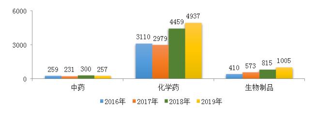 ͼ1 2016-2019ÄêÖÖÖÖÒ©Æ·×¢²áÉêÇëÊÜÀíÇéÐÎ
