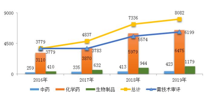 ×¢£º1.2019ÄêÊÜÀíÁ¿Öк¬5¼þÆ÷е×éºÏ²úÆ·µÄ×¢²áÉêÇ룬¹ÊÉÏͼÖÐ2019ÄêÊÜÀí×¢²áÉêÇë×ÜÁ¿´óÓÚÖÐÒ©¡¢»¯Ñ§Ò©¡¢ÉúÎïÖÆÆ·ÊÜÀí×¢²áÉêÇëÖ®ºÍ£»2. Ò©ÉóÖÐÐĵÄÖ±½ÓÐÐÕþÉóÅúÊÂÇé×Ô2017Äê×îÏÈ£¬ÒÔÊÇ2016ÄêÎÞÖ±½ÓÐÐÕþÉóÅú×¢²áÉêÇ룬ËùÓÐÊÜÀí×¢²áÉêÇë¾ùÐèÊÖÒÕÉóÆÀ ¡£