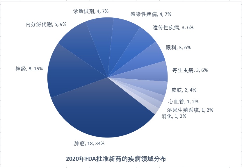 ´Ó¼²²¡ÁìÓòÀ´¿´£¬2020ÄêFDAÅú×¼µÄÐÂÒ©ÈÔÒÔÖ×ÁöÒ©¾Ó¶à£¬Õ¼±È34%£¨18/53£©£¬ÆäËûÕ¼½ÏÁ¿¸ßµÄ¼²²¡ÁìÓò»¹°üÀ¨Éñ¾­£¨15%£¬8/53£©¡¢ÄÚÉøÍ¸´úл£¨9%£¬5/53£©¡¢Õï¶ÏÊÔ¼Á£¨7%£¬4/53£©¡¢Ñ¬È¾ÐÔ¼²² ¡£¨7%£¬4/53£© ¡£