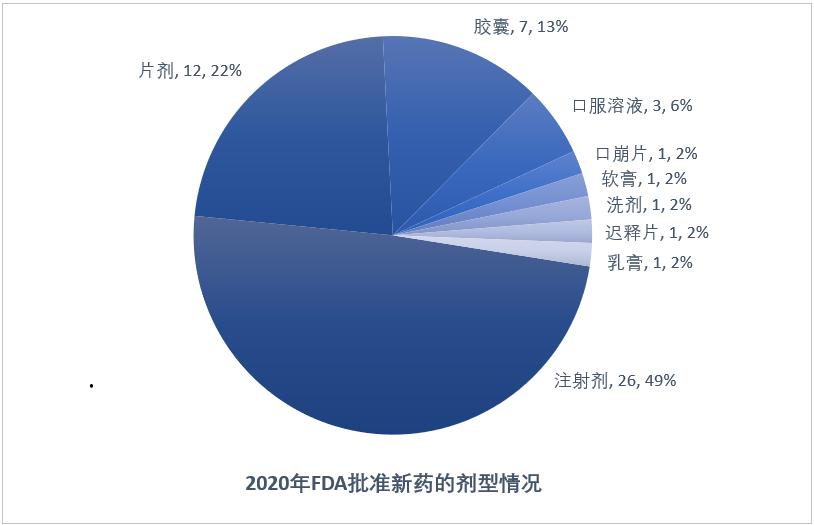 ´ÓÒ©Îï¼ÁÐÍÀ´¿´£¬2020ÄêFDAÅú×¼µÄÐÂÒ©ÖÐ×¢Éä¼Á×î¶à£¬Õ¼±È50%£¨26/53£©£¬Æä´ÎÊÇͨË׿ڷþƬ¼ÁºÍ½ºÄÒ¼Á ¡£