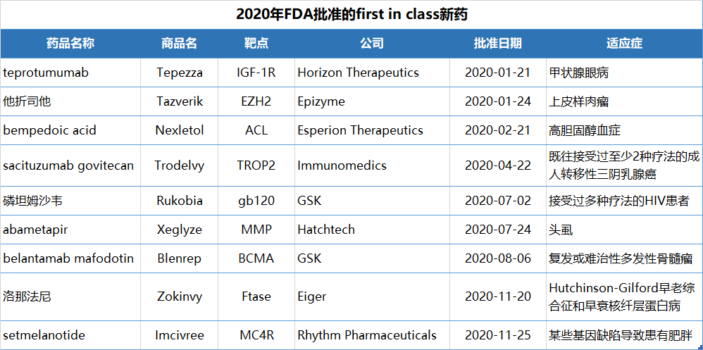 2020ÄêFDA»ñÅúµÄÐÂÒ©ÖУ¬ÓÐ9¿îÊôÓÚFirst-in-classÒ©ÎÏêϸƷÖÖÈçÏ£º