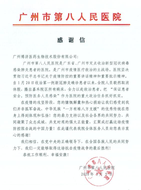 广州市第八人民医院、湘潭第一人民医院等医疗机构也纷纷发来谢谢信,谢谢333体育官网医药在要害时刻伸出援助之手,给予了医护职员战胜疫情的信心与力量。