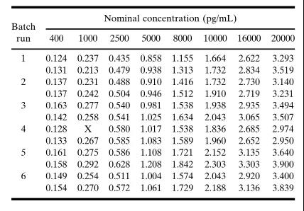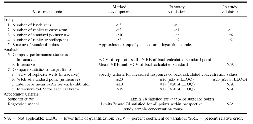 ÔÚÑо¿ÖÐÑé֤ʱ£¬³ýÁËÔÚÊӲ쵽»ùÖÊ×ÌÈÅʱÐèÒªÌØÊâÏ¡ÊÍÑù±¾Í⣬ûÓÐÓëÑù±¾ÖƱ¸Ïà¹ØµÄ½ÓÊܱê×¼¡£ÓÉÓÚDZÔڵĻùÖÊ×ÌÈŶøµ¼ÖÂÖØÐÂÆÊÎöÑùƷʱ£¬Ó¦µ±Ô¤ÏÈÉ趨²¢Í¨ÀýµØÓ¦ÓÃÏà¹ØÖ¸µ¼ÔÔò¡£ÔÚ»ùÖÊÅú´Îת±äµÄÇéÐÎÏ£¬Ó¦µ±ÖƱ¸ÏàͬŨ¶ÈµÄQCÑùÆ·£¬Ö¤ÊµÓëÑо¿Ç°ÑéÖ¤Êý¾ÝµÄ¿É±ÈÐÔ£¬È»ºó¼ÌÐø¾ÙÐÐÑùÌìÖ°Îö¡£±ê׼У׼ÎSTANDARD CALIBARTOR)ºÍ±ê×¼ÇúÏß½«ÒÑÖªÊýÄ¿±íÕ÷ÓÅÒìµÄ±ê×¼²ÎÕÕ£¨±È£©Î´ý²âÎanalyte£©¼ÓÈëµ½Êʵ±µÄ»ùÖÊÖÐÖÆ±¸±ê׼У׼Ʒ£¬Ôڼȶ¨µÄÆÊÎöÌõ¼þÏÂÌìÉú²¢»ñµÃŨ¶È-ÏìÓ¦¹ØÏµ£¬¼´±ê£¨Ð££©×¼ÇúÏߣ¨standard curve£©¡£Æ¾Ö¤Õâ¸ö±ê£¨Ð££©×¼ÇúÏߣ¬Î´ÖªÑùÆ·ÖÐÆÊÎöÎïµÄŨ¶È¿ÉÒÔͨ¹ýÄÚ²åÒªÁìÅÌËã¡£ÔÚÒªÁ쿪·¢Àú³ÌÖУ¬Ó¦µ±½¨Éè±ê׼ƷµÄŨ¶ÈºÍ½«Ò»ÌõÇúÏßÄâºÏÓÚУ׼Êý¾ÝµÄ»Ø¹éÄ£×Ó£¬´ËÄ£×ÓÐèÔÚÑо¿Ç°Ñé֤ʱ´ú»ñµÃÈ·ÈÏ£¬²¢ÔÚÆÊÎöÑо¿Ñù±¾Ê±Ê¹ÓᣱíIII»ã×ÜÁËÆÀ¹À±ê×¼ÇúÏßÊý¾ÝÉè¼ÆºÍÆÊÎö»Ø¹éÄ£×ӵĽ¨Ò飬½«Ê¹ÓñíIVÖеÄÑо¿Ç°ÑéÖ¤µÄ±ê×¼ÇúÏßÊýÌý˵Ã÷ͳ¼ÆÆÊÎöµÄÀú³Ì¡£±íIII. ±ê×¼ÇúÏ߯À¶¨±ê×¼. £¨Î´°üÀ¨¡°Ãª¶¨µã¡±£©