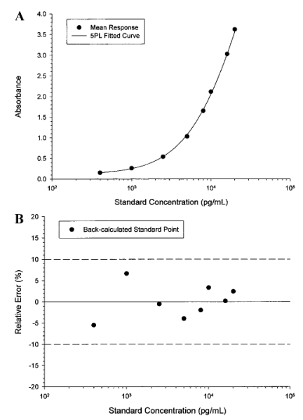 ÓÉÓÚ±ê×¼µãŨ¶ÈÔÚÒªÁìÑéÖ¤×îÏȺó²»Ó¦¸Ä±ä£¬Òò´ËÔÚÒªÁ쿪·¢Àú³ÌÖÐÓ¦°üÀ¨¸ü¶àµÄ±ê×¼µã£¨standard point£©ºÍÖØ¸´µã£¨replicates£©£¬ÒԱ㾡ÔçµØÏêϸÑо¿Å¨¶È-ÏìÓ¦¹ØÏµ£¬¾¡¿ÉÄܵØÊµÏÖΪ»Ø¹éÄ£×ÓÌṩ¿É¿¿µÄÆÀ¹À¡£±ê×¼²ÎÕÕ£¨±È£©ÎïŨ¶ÈµãµÄ¹æÄ£Ó¦°üÀ¨Ï¡ÊͺóÑо¿ÑùÆ·µÄŨ¶È£¬²¢ÔÚ¶ÔÊý¿Ì¶ÈÉϽüËÆÔȳƵؾàÀë¡£½¨ÒéÖÁÉÙÓÐ10¸ö·ÇÁã±ê׼Ũ¶Èµã£¨¸´¿×£¬duplicate£©ÓÃÓÚŨ¶È-ÏìÓ¦¹ØÏµ£¬ÓÃÓÚÆäÔçÆÚÌØÕ÷µÄÐÎò¡£¸ÃŨ¶È-ÏìÓ¦¹ØÏµ¿ÉÒÔʹÓÃ4/5²ÎÊýµÄlogisticº¯Êý£¨4/5PL Ä£×Ó£©À´ÐÎò¡£±ê×¼ÇúÏßÓ¦ÄâºÏУ׼Ũ¶ÈµãµÄƽ¾ùÏìÓ¦Öµ£¨Í¼1A£©¡£Í¼1. A.5²ÎÊýlogistic (5PL)¼ÓȨ·ÇÏßÐÔ×îС¶þ³Ë·¨»Ø¹éÄâºÏµÄÇúÏß¡£Æ½¾ùÏìÓ¦ÊDZíIV.ÖÐÁгöÁ˵Ú6¸öÔËÐУ¨batch£©µÄÖØ¸´Ð§¹û¡£B.ͼ1AÖлØËã±ê×¼µãŨ¶ÈµÄ°Ù·Ö±ÈÏà¶ÔÎó²î¡£ËùÓÐÊýÖµ¶¼ÔÚ±ê³ÆÖµµÄ10%ÒÔÄÚ¡£