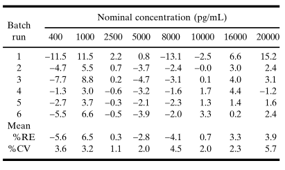 ÔÚ½¨ÉèУ׼ģ×Óʱ£¬½¨ÒéÆÊÎöÖÁÉÙ3¸ö×ÔÁ¦ÔËÐУ¨batch/run£©µÄ±ê×¼ÇúÏßŨ¶È-ÏìÓ¦Êý¾Ý£¬Ã¿´ÎÔËÐÐÓ¦°üÀ¨Á½Ìõ±ê×¼ÇúÏߣ¬ÒÔ±ãÆÀ¹ÀÔËÐÐÄÚ±ê×¼ÇúÏߵĿÉÖØ¸´ÐÔ¡£Ä£×ÓµÄÏàÒËÐÔÈ¡¾öÓÚ±ê×¼µã»ØËãŨ¶ÈµÄRE£¬ÅÌËãÒ»¸öŨ¶ÈµãµÄREÈçÏ£º´Ó»ØËãŨ¶ÈÖмõÈ¥±ê³ÆÅ¨¶È²¢½«Æä²îÖµ³ýÒÔ±ê³ÆÅ¨¶È¡£Í¨³££¬¹ØÓÚÇúÏßÄڵĴó´ó¶¼±ê×¼µã»ØËãŨ¶ÈµÄ¾ø¶ÔREӦΪ20%¡£ÀýÈ磬ƾ֤¼ÓȨ5PL»Ø¹éÇúÏßÄâºÏƽ¾ù¹âÎüÊÕÖµ£¨±íIVÖеÚ6¸öÔËÐеÄÊý¾Ý£©ËùµÃ³öµÄÄ£×Ó£¬»ØËãŨ¶ÈµÄ¾ø¶ÔREs¶¼ÊÇ<10%£¨±íVºÍͼ1B£©¡£Í¬Ñù£¬ÆäËû5¸öÔËÐеľø¶ÔREsҲʼÖÕÒ»ÖµØ<10%£¨µÚ1¸öÔËÐÐÖеöµã³ýÍ⣩¡£