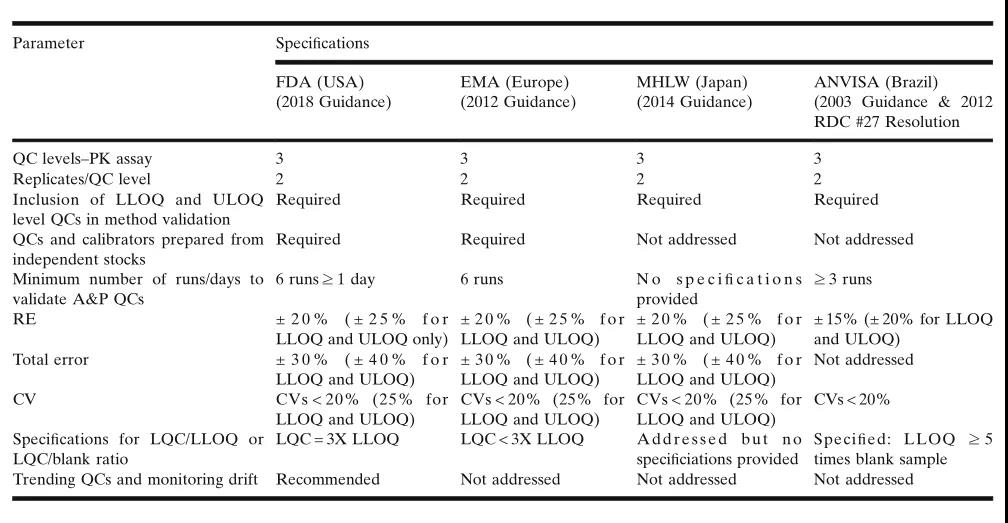 LBA²âÊÔÖеÄQCÑùÆ· £¬Ó¦Í¨¹ýÔÚ¼°¸ñ£¨qualified£©µÄ»ùÖÊÖмÓÈëÒÑ֪Ũ¶ÈµÄ²Î¿¼£¨±È£©±ê׼Ʒ£¨ÓÃÓÚPK¶¨Á¿ÆÊÎö£© £¬»òÏ¡ÊÍ/ŨËõµÄº¬ÓÐÑôÐÔ±ÈÕÕ¿¹ÌåµÄÔ­Òº£¨ÓÃÓÚADA²âÊÔ£©À´ÖƱ¸¡£¹ØÓÚQCÑùÆ·µÄ×é³É¡¢Ä¿µÄÖµºÍ½ÓÊܱê×¼µÄͨÓÃÖ¸ÄÏ £¬ÒÑÓÉÏÂÊöî¿Ïµ»ú¹¹Ðû²¼£ºÃÀ¹úFDA £¬Å·ÖÞÒ©¼à¾Ö(EMA) £¬ÈÕ±¾ÎÀÉú²¿ £¬ÀͶ¯ºÍ¸£Àû(MHLW)ºÍ°ÍÎ÷ÎÀÉú¼à²ì¾Ö(ANVISA)¡£±í3×ܽáÁËî¿Ïµ»ú¹¹¹ØÓÚ¶¨Á¿£¨PK£©ÆÊÎöÖÐËùʹÓõÄQCsµÄÖÆ±¸ºÍ×é³ÉµÄÒªÇó¡£