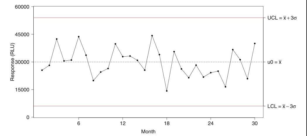 ͼ1. Levey-JenningsͼʾÀý¡£Ë®Æ½ºìÏßΪÏÂ/ÉÏÏÞÖµ£¨lower/upper control limits £¬L/UCL£© £»ÐéÏßˮƽºáÏßΪÊÓ²ìÆ½¾ùÖµ£¨¦Ì0£©¡£