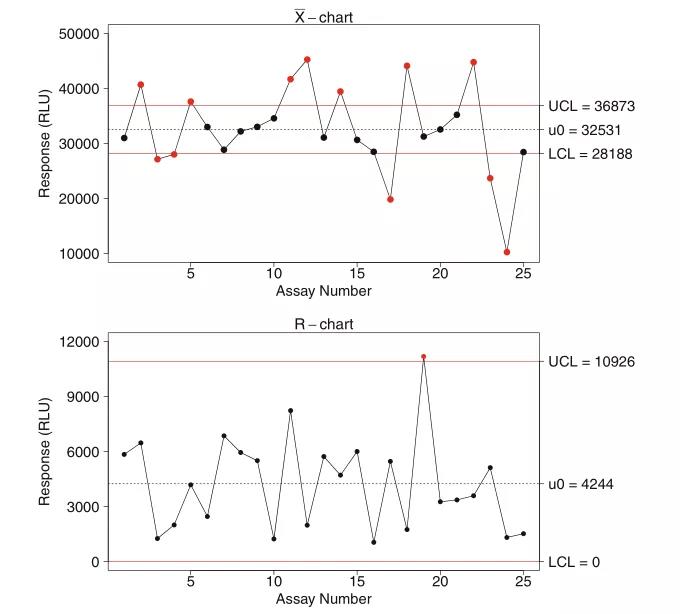 ͼ2. Xbar-RͼµÄʾÀý¡£Xbarͼ±íÏÔʾÁËÿ¸öʵÑéµÄƽ¾ùÖµ £»µ×²¿ÊÇRͼ £¬ÌåÏÖÿ¸öÆÊÎöµÄÊÓ²ì¹æÄ£¡£¹ØÓÚÕâÁ½ÕÅͼ £¬Ë®Æ½µÄºìÏßÊÇÏÂÏÞÖµºÍÉÏÏÞÖµ; ˮƽºÚÏßÐéÏßÊÇʵÑéÖÐÊӲ쵽µÄƽ¾ùÖµ¡£